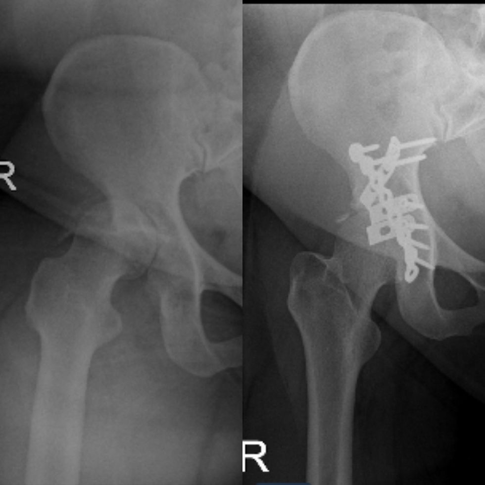 Wanita berusia 30 tahun mengalami kemalangan jalanraya. Tulang pinggul beliau terkehel dan patah. Beliau menjalani pembedahan untuk memperbaiki sendi pinggul dengan plet dan screw. X-ray menunjukkan kepatahan pada sendi pinggul sedang pulih kembali.